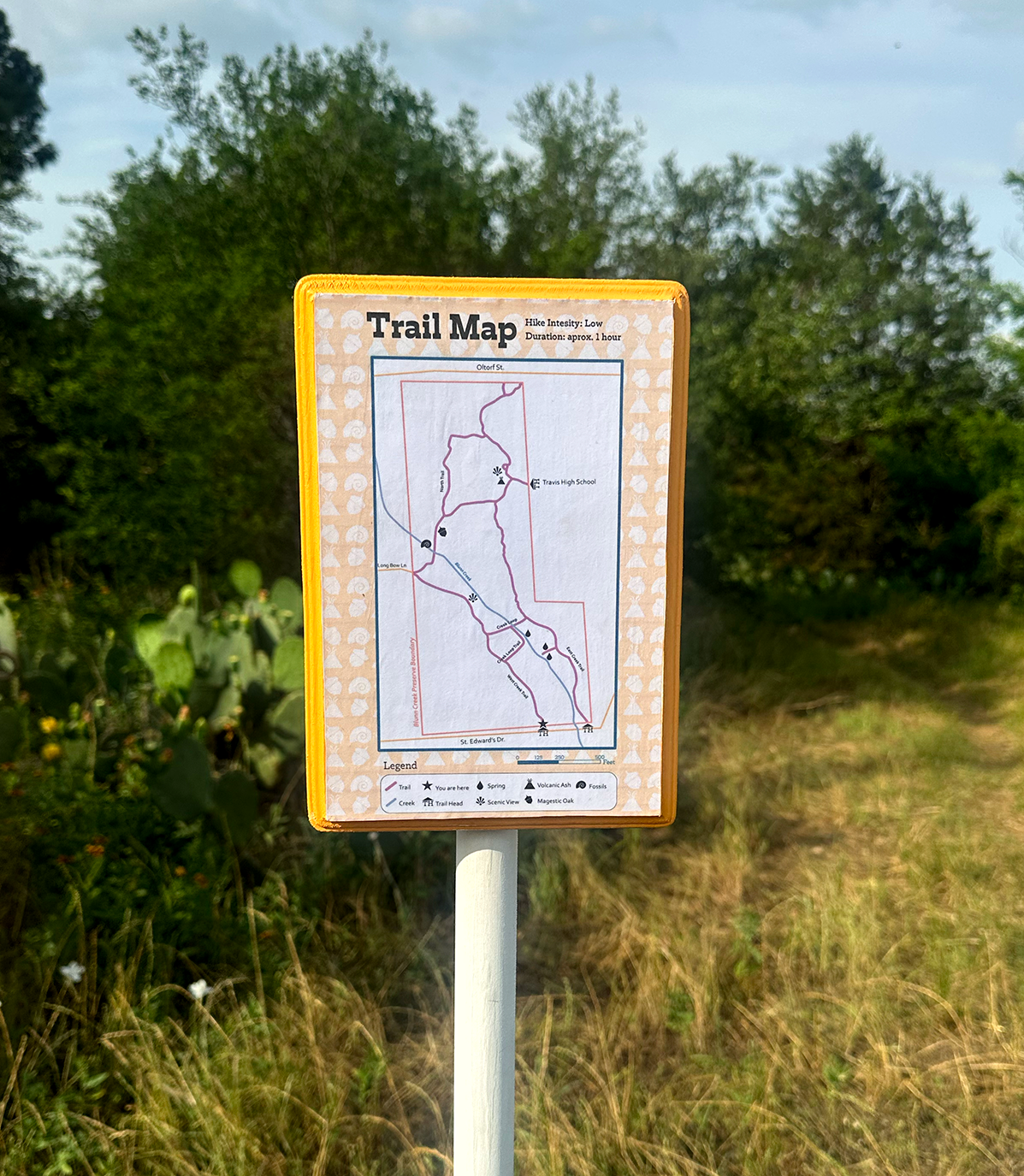 My primary motivation and direction became focused on hiking. I constructed a trailhead sign with a corresponding map. Mimicking the logo, the sign consisted of three slats across, each containing information: location, trail entrance name with hours, and rules. Consistent with the colors from the logo, each sign would be one of the colors in two lighter shades. The map indicated where the hiker was and notable natural features throughout the nature preserve.